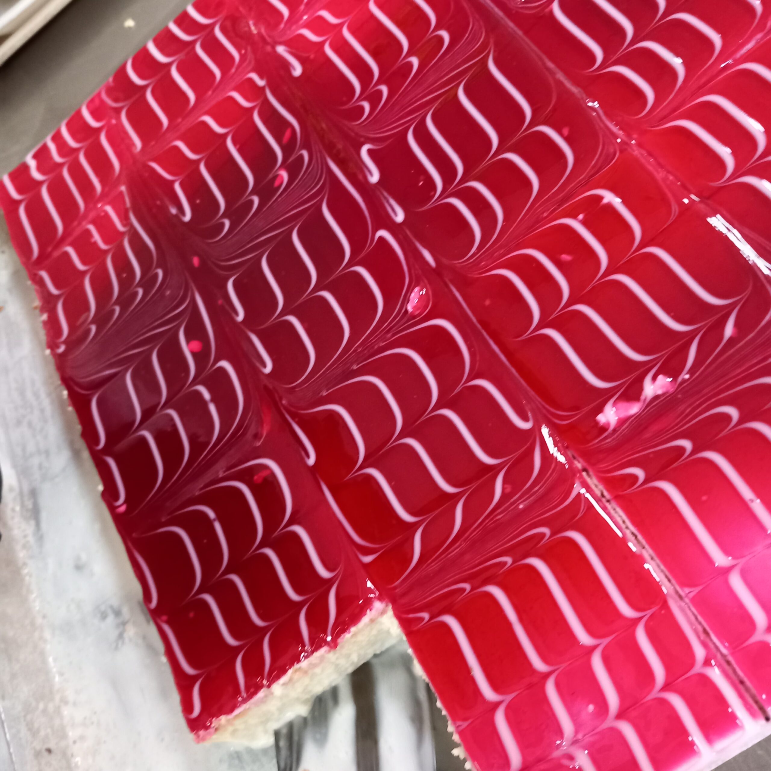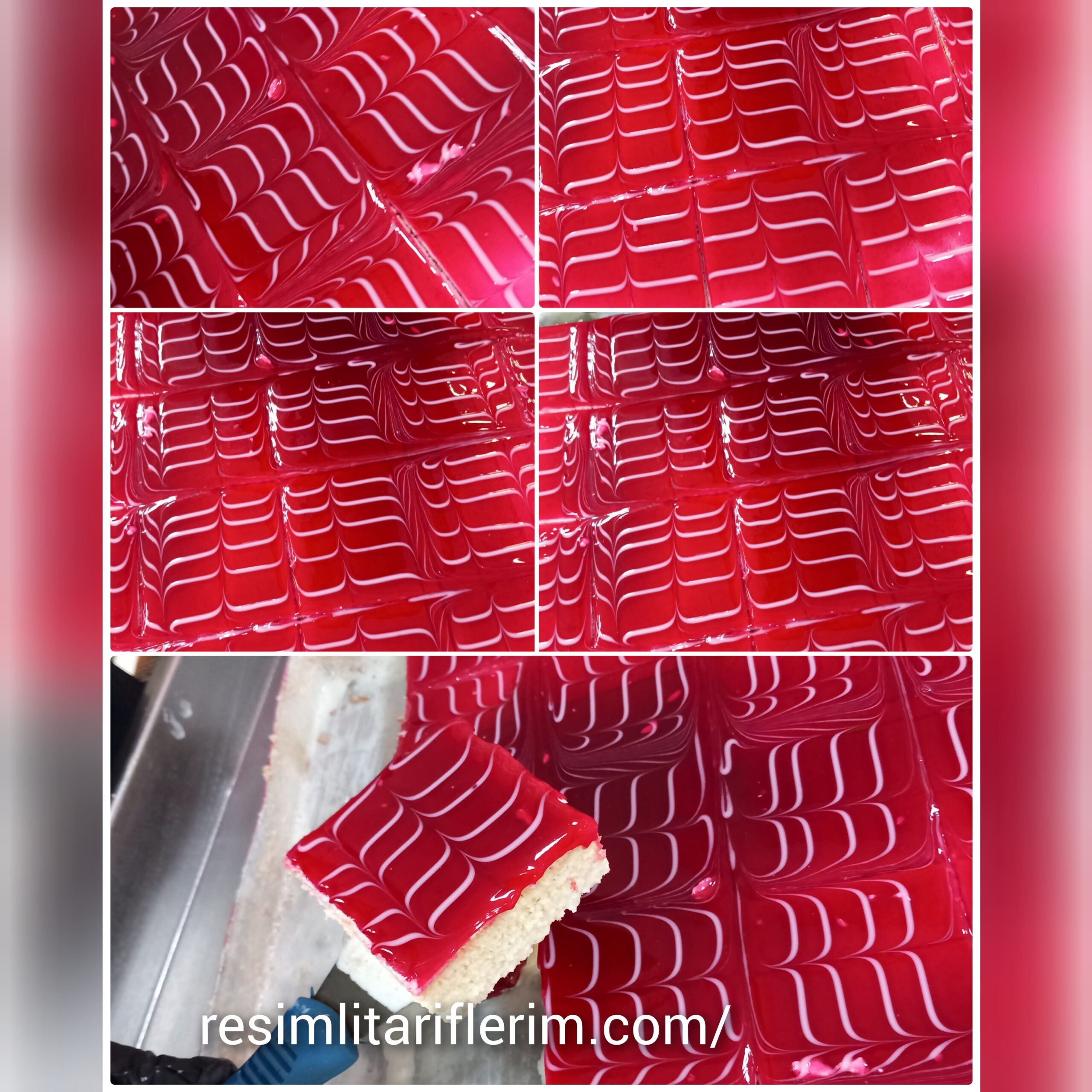 Ve pişirip soğuttuğumuz frambuaz sosunu da döküp dikkatlice eşit şekilde dağıtalım.(ben krem santi ile şeritler yaptım siz dilerseniz yapmayadabilirsiniz)