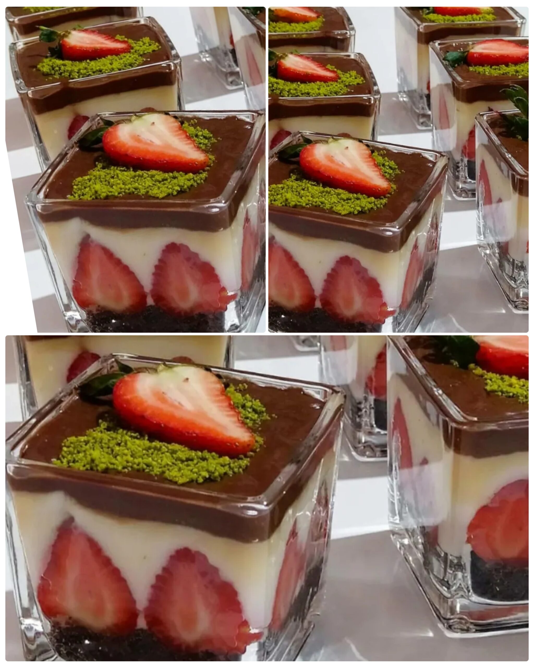 tencereye süt şeker un nişasta yumurta sarısı alıp tel çırpıcı ile çırpılır ocağa alıp muhallebi kıvamına gelene kadar karıştırarak pişirilir ocaktan alıp tereyağ vanilya çikolata eklenir karıştırılır en son süt kreması eklenir iyice çırpılır pürüzsüz olacak şekilde kuplara önce ufalanmış bisküvi tabana dökülür yerleştirilir kenarlara çilek dilimleri yerleştirilir krema dökülür üzerine çikolata sosu döküp dolapta dinlendirilir sonra toz antep fıstığı ve