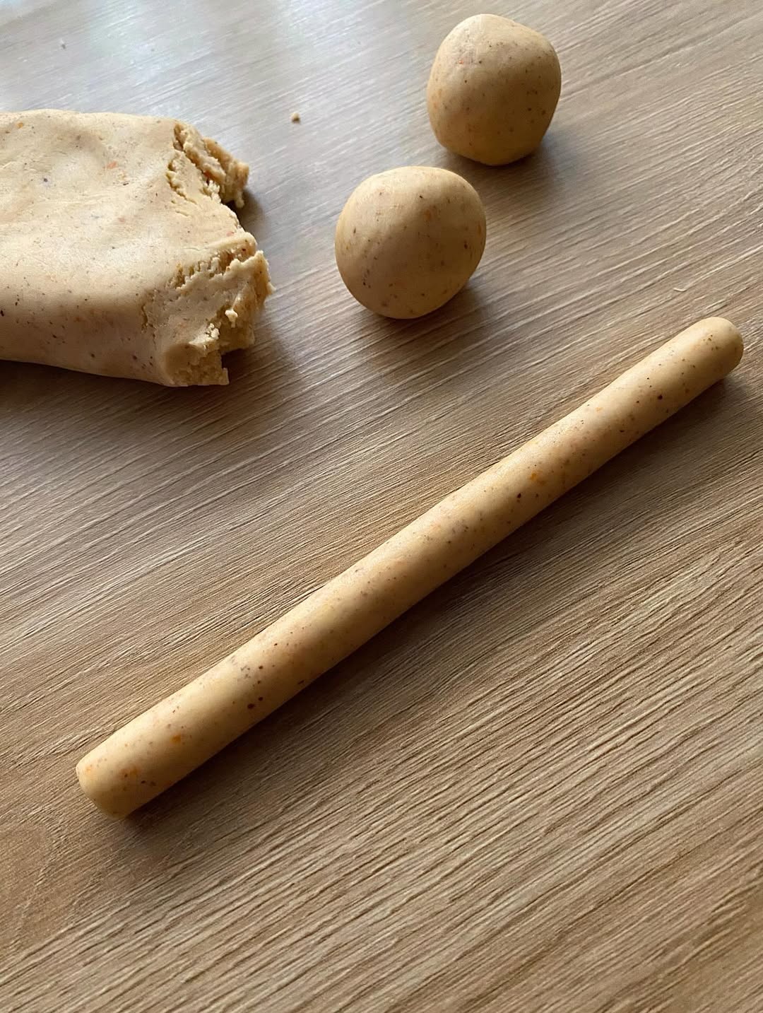 5. Her bir parçayı tezgâh üzerinde 15–20 cm uzunluğunda, silindir çubuklar haline getirelim.